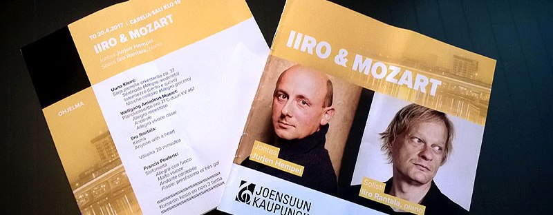 Kävin pitkästä aikaa Joensuun kaupunginorkesterin konsertissa, taisi olla tämän vuoden puolella jopa ensimmäinen kerta. Ohjelmassa oli pianisti Iiro Rantalan tulkinta Wolfgang Amadeus Mozartin pianokonsertosta nro 21 C-duuri KV 467. Lisäksi kuultiin Rantalan omaa tuotantoa sekä Uuno Klamia ja Francis Poulencia. Konsertin johti Joensuun kaupunginorkesterin hollantilaissyntyinen kapellimestari ja taiteellinen johtaja Jurjen Hempel.
